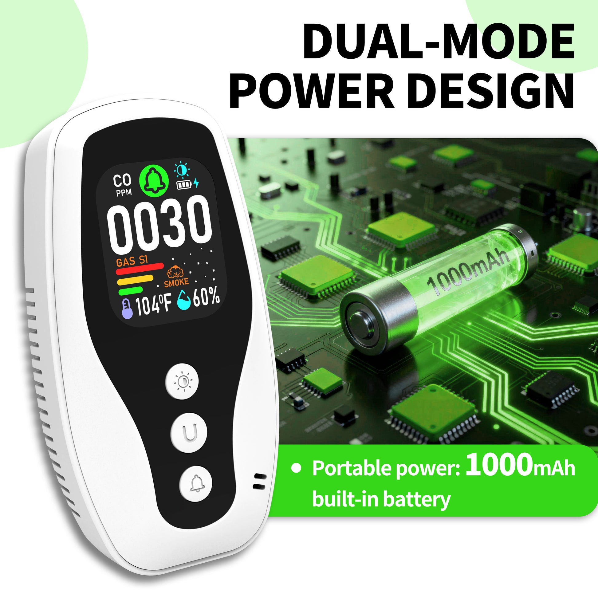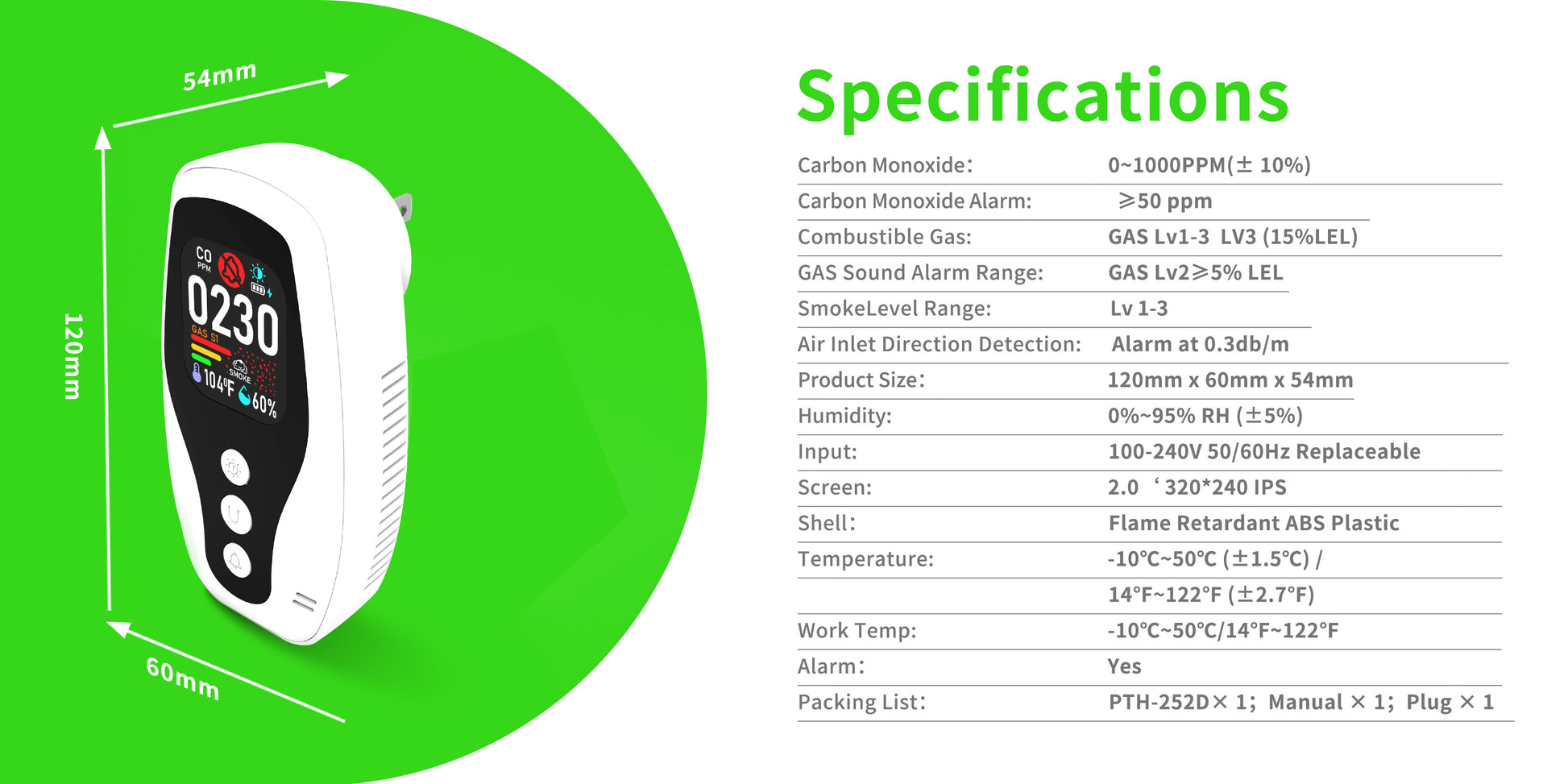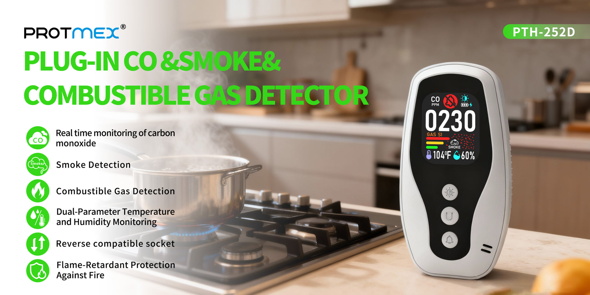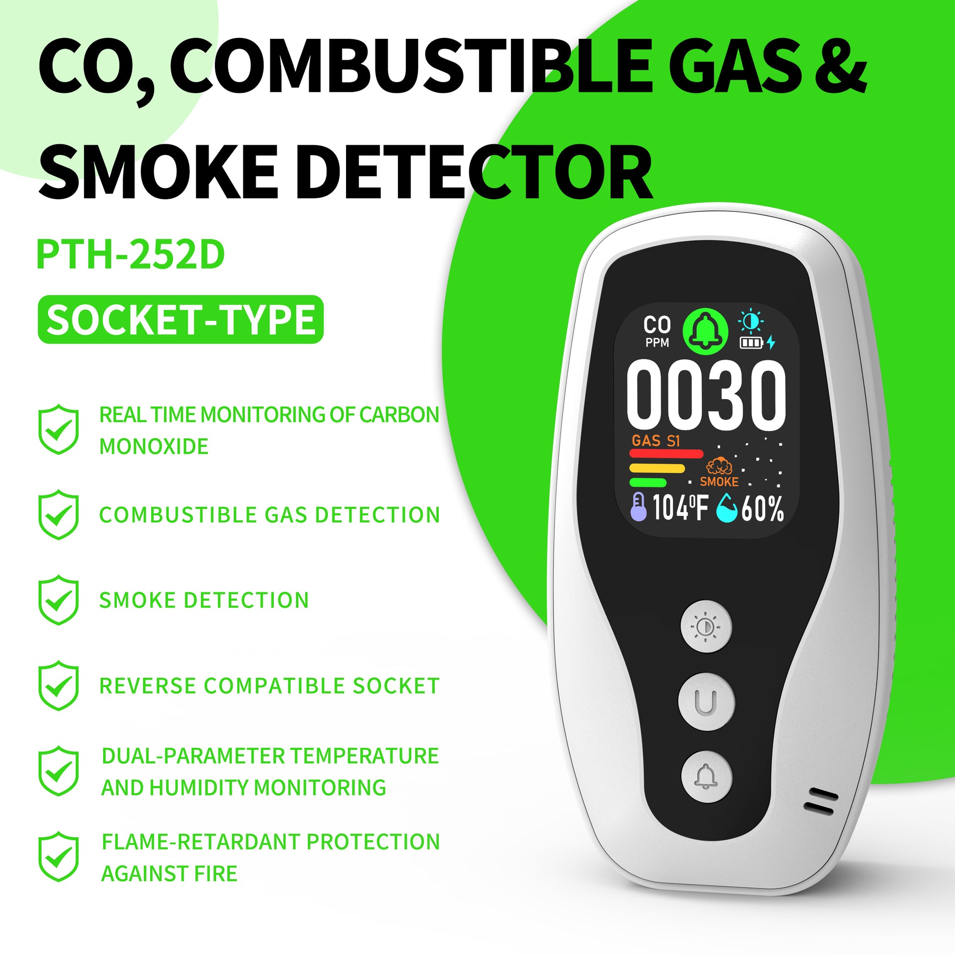 一酸化炭素のリアルタイム監視、可燃性ガス検知、煙検知、リバース互換ソケット、デュアルパラメータ温度および湿度監視、火災に対する難燃性保護。