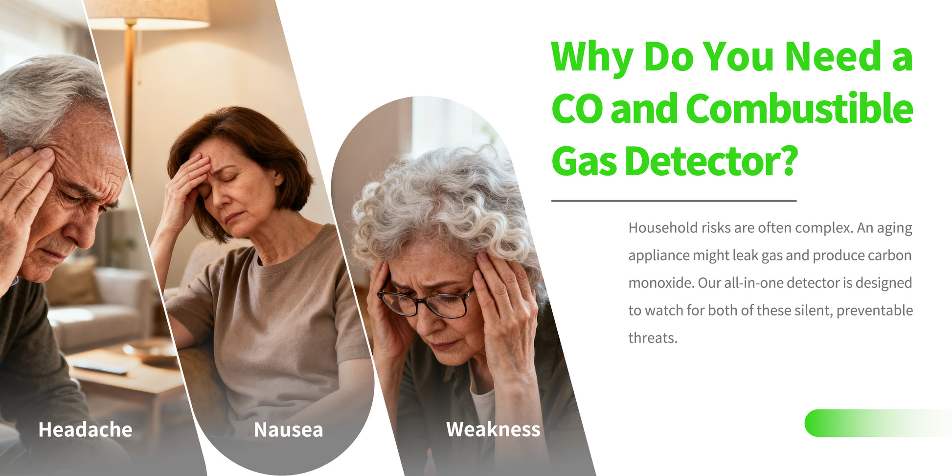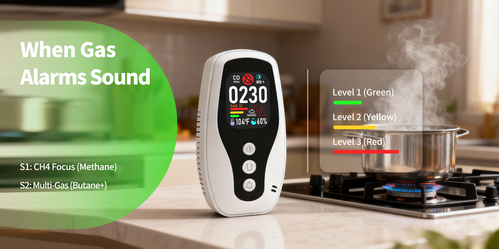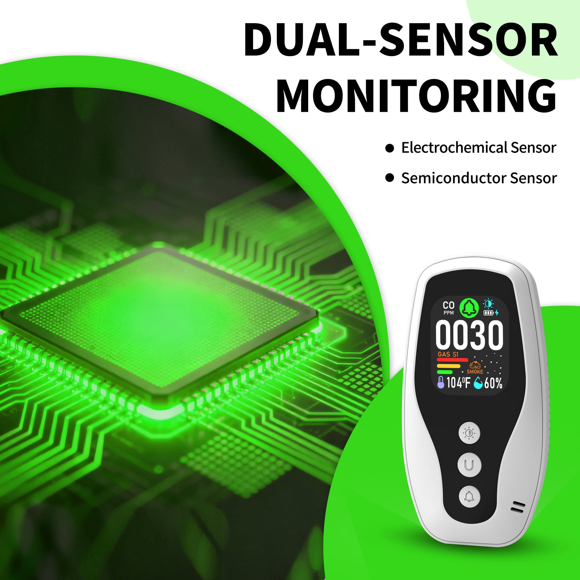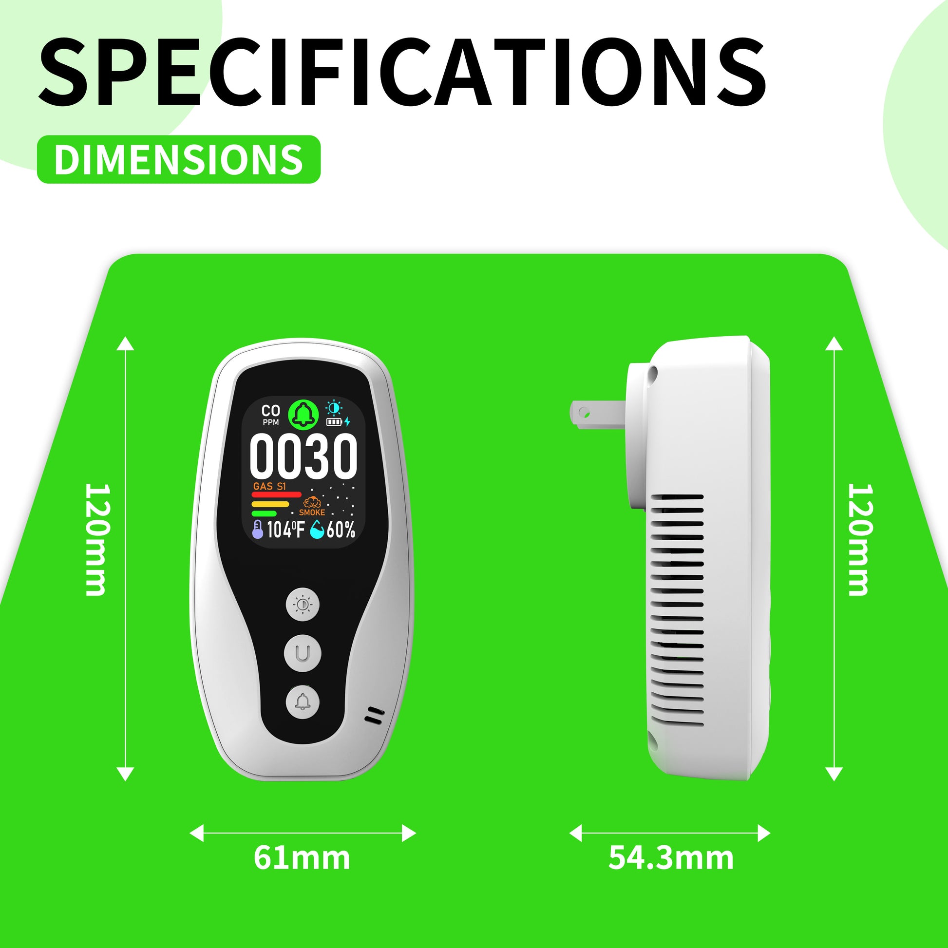一酸化炭素のリアルタイム監視、可燃性ガス検知、煙検知、リバース互換ソケット、デュアルパラメータ温度および湿度監視、火災に対する難燃性保護。