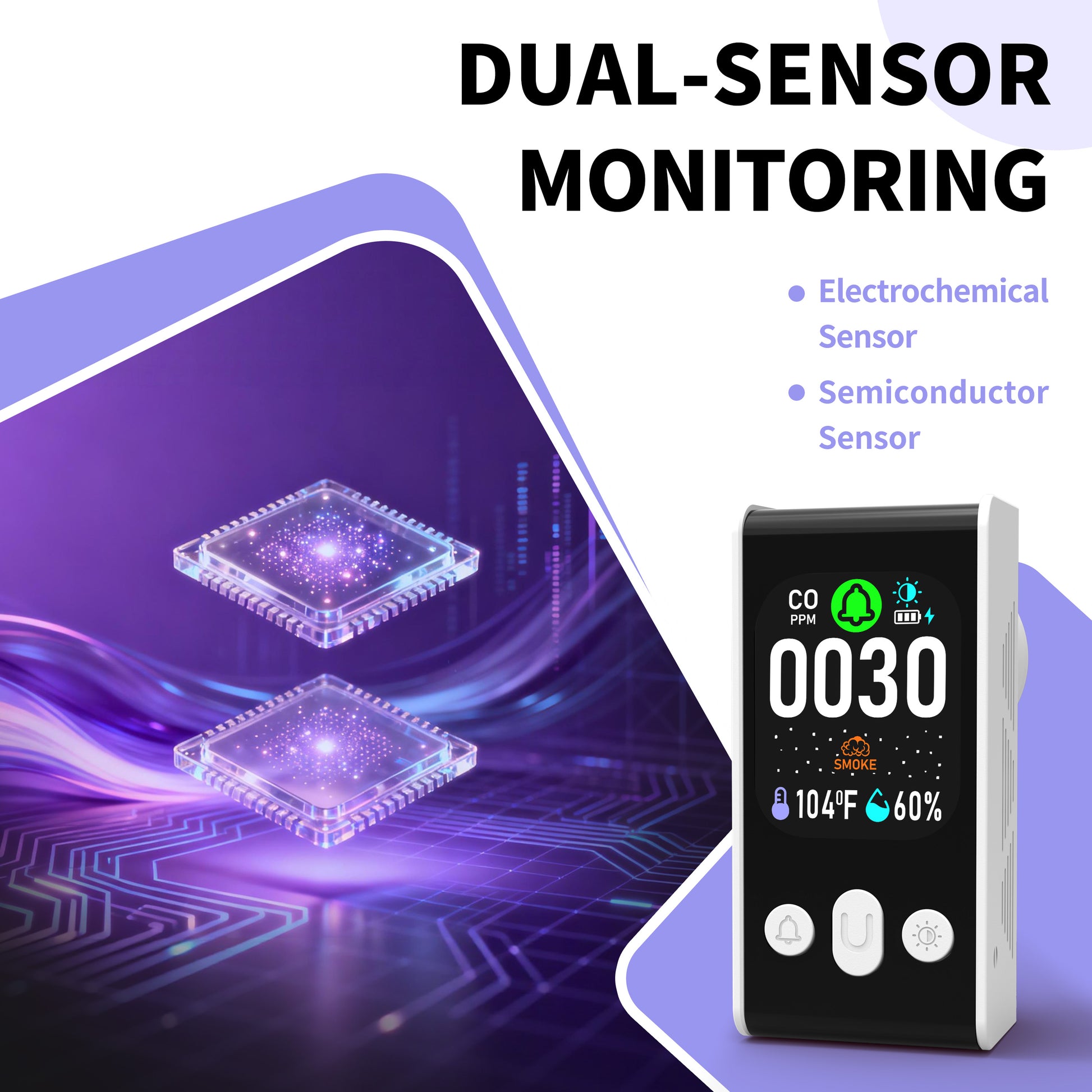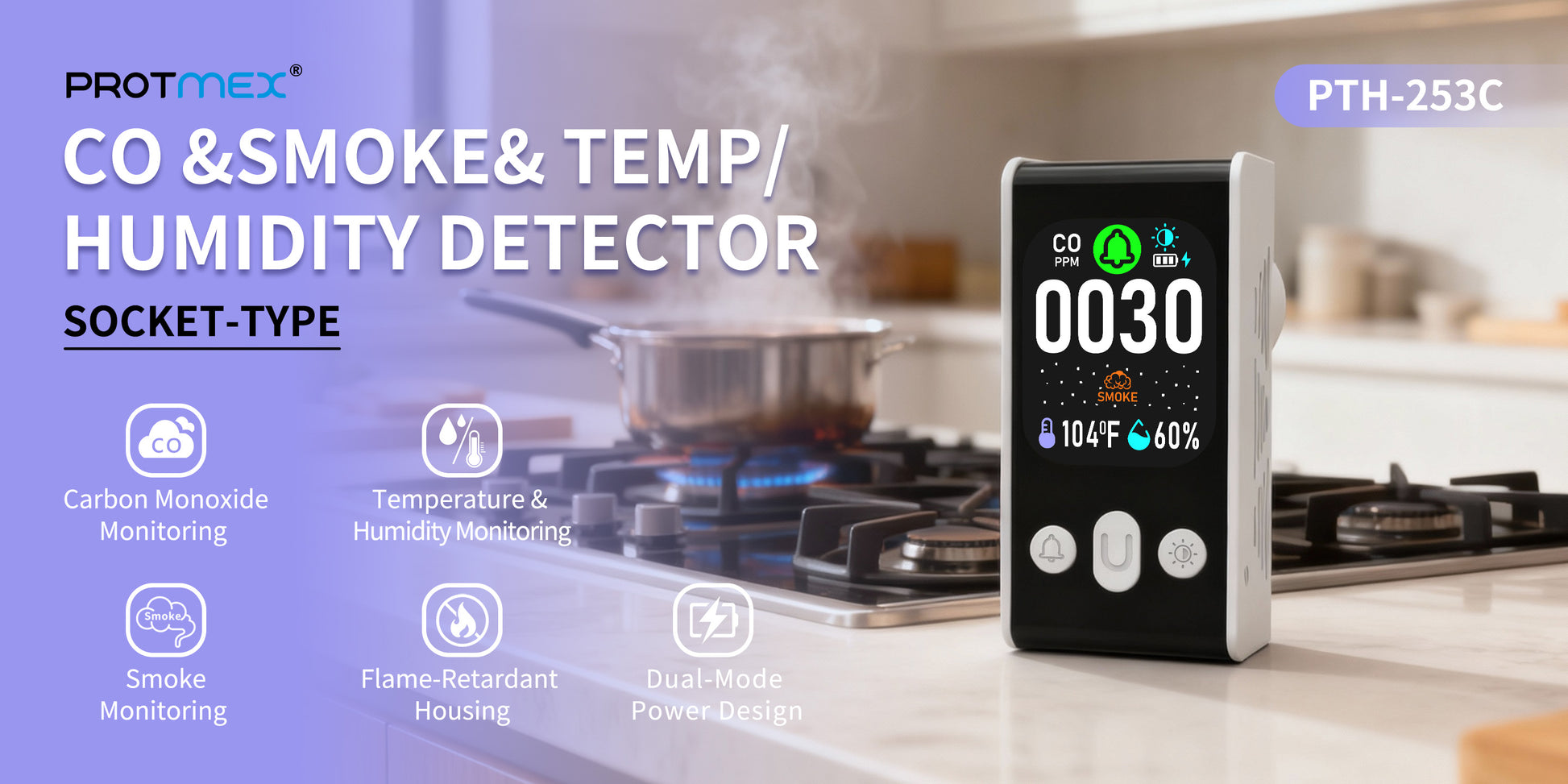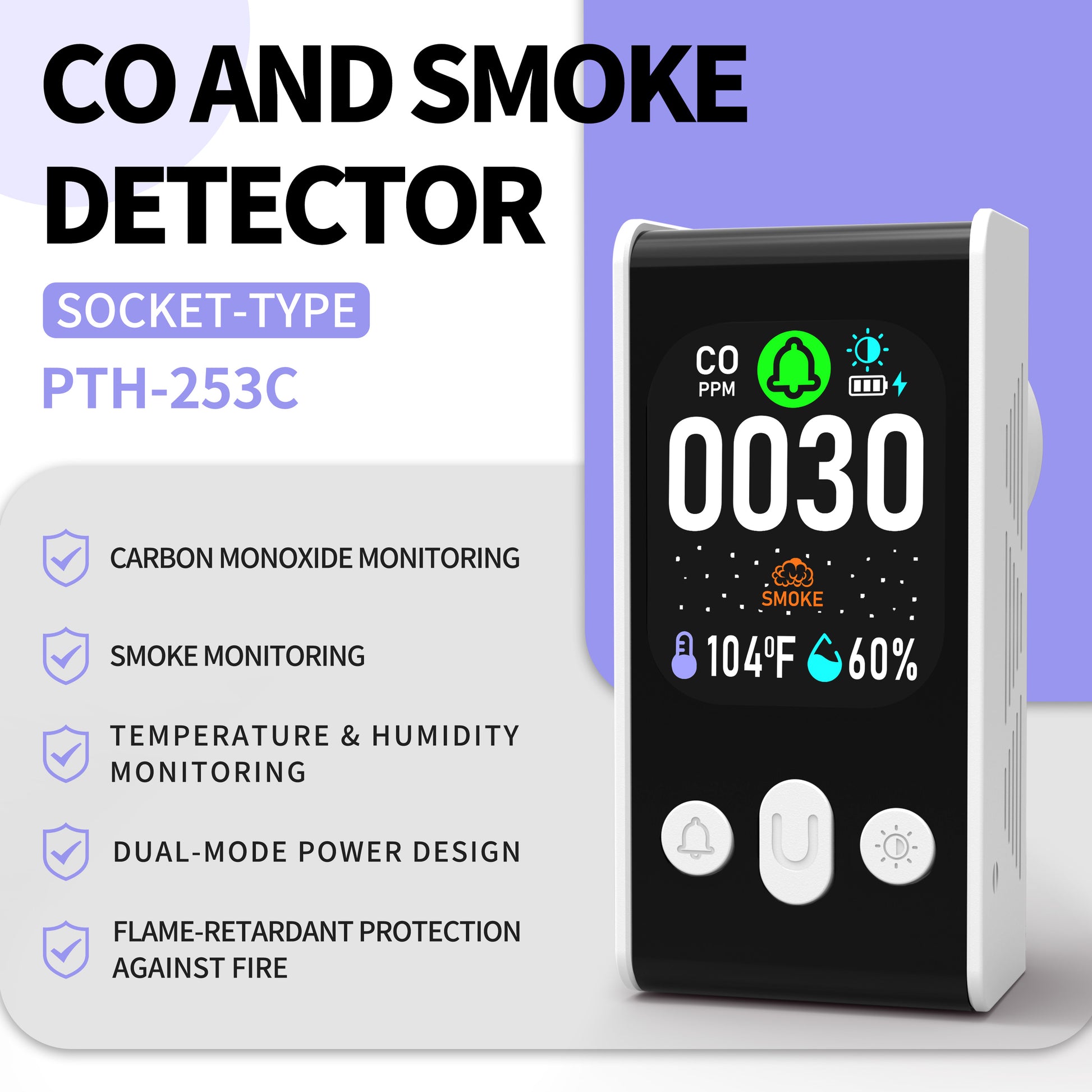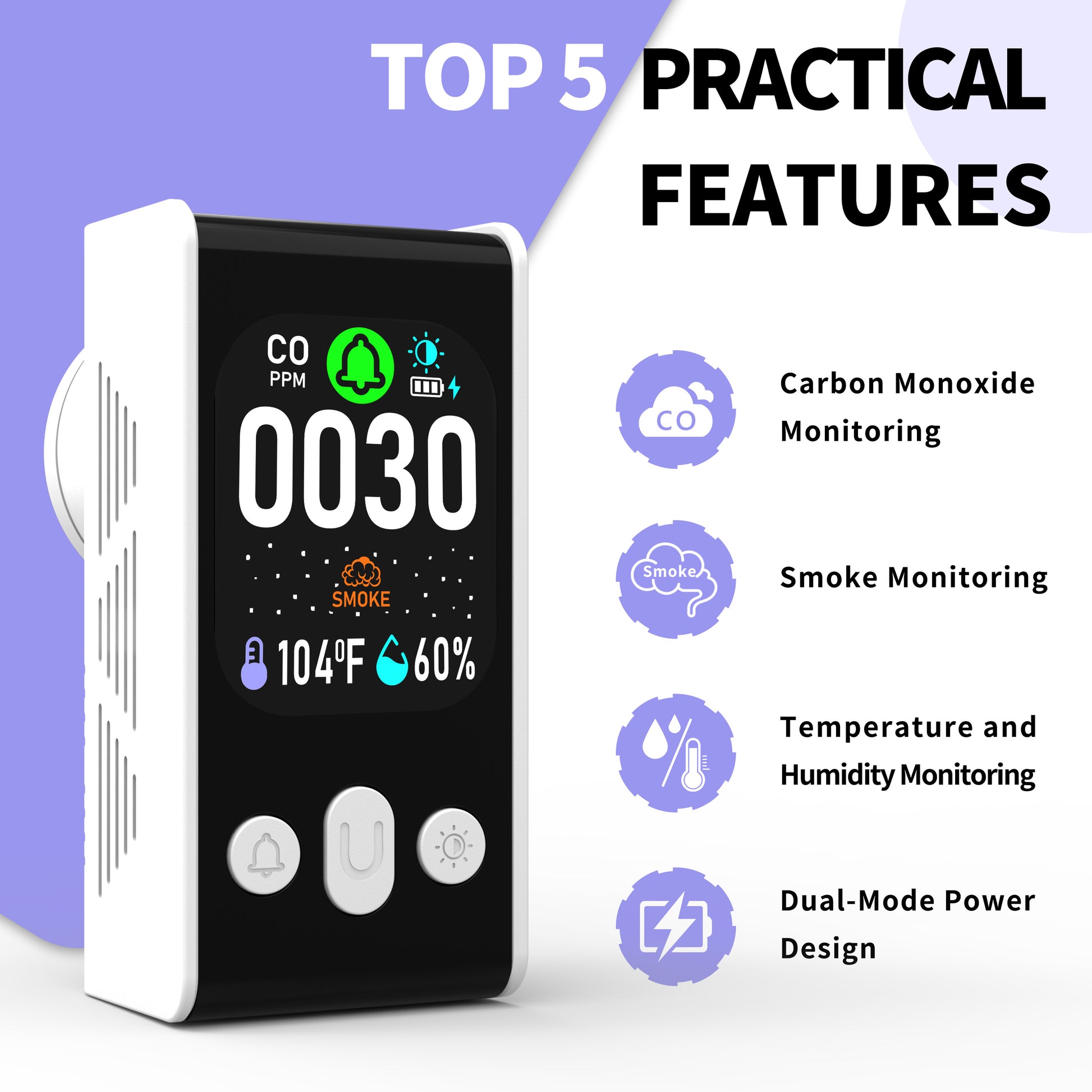 Carbon Monoxide detector, Smoke Monitoring, Temperature and Humidity Monitoring , Dual Mode Power Design, Flame Retardant Protection against Fire.