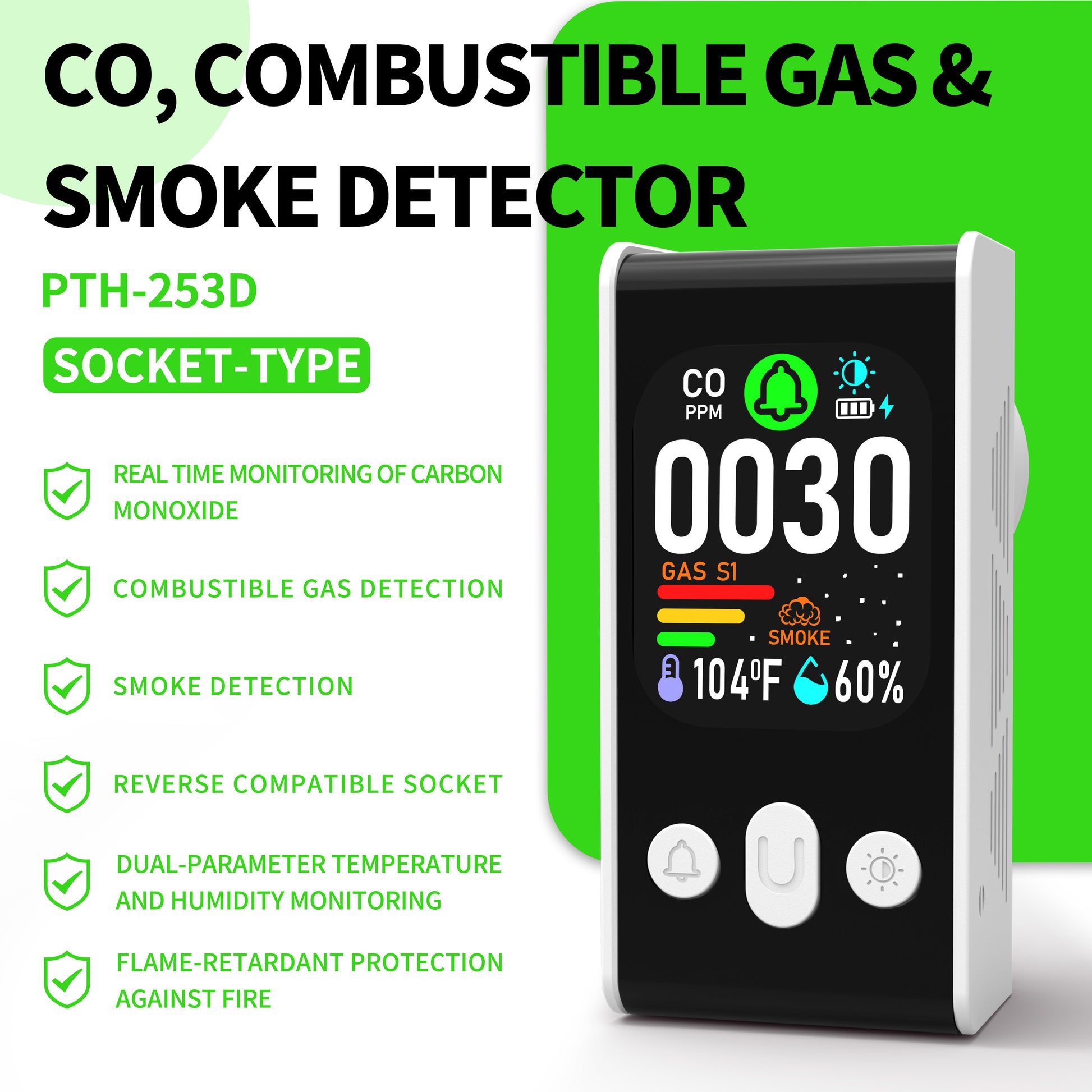 Real Time Monitoring of Carbon Monoxide, Combustible Gas Detection, Smoke Detection, Reverse Compatible Socket, Dual Parameter Temperature and Humidity Monitoring ,Flame Retardant Protection against Fire.