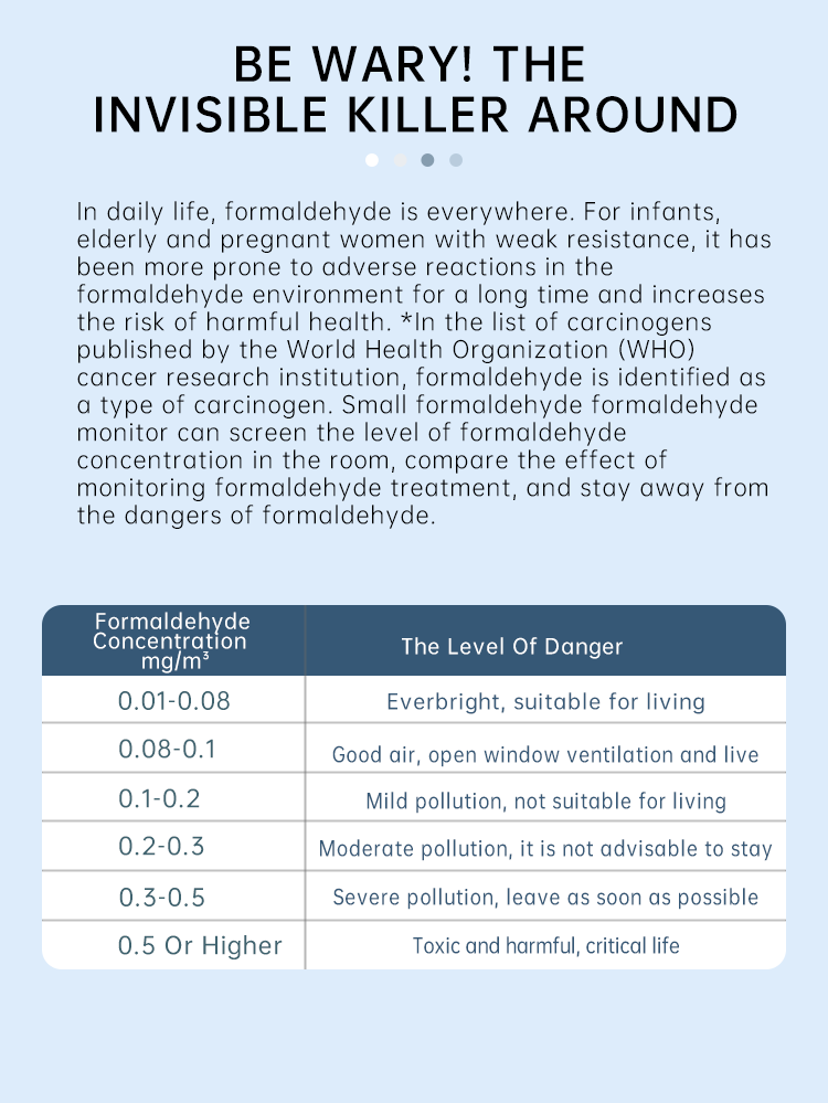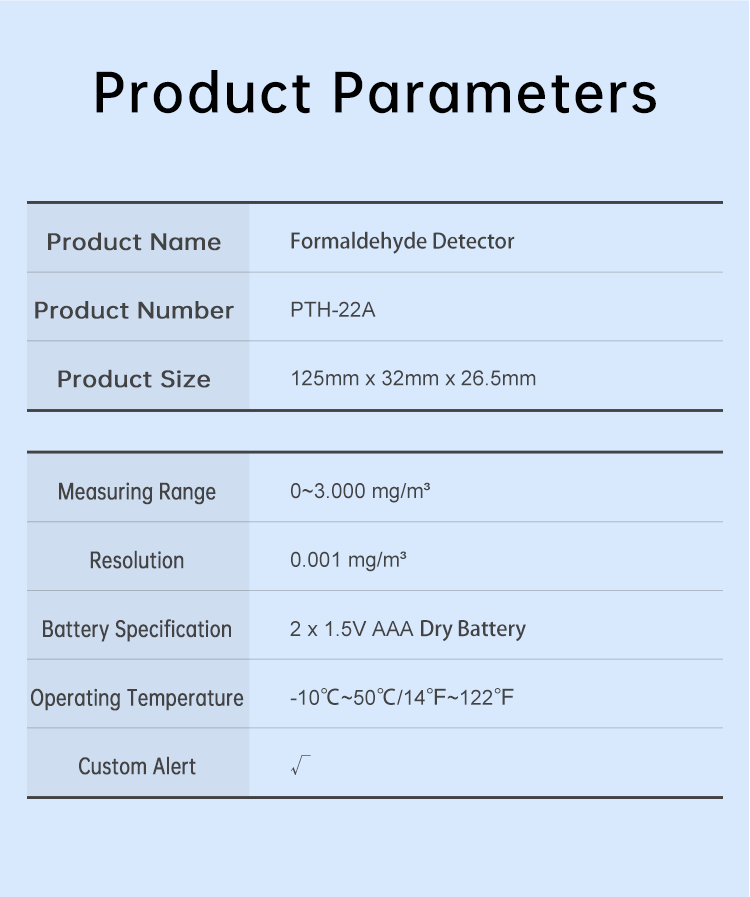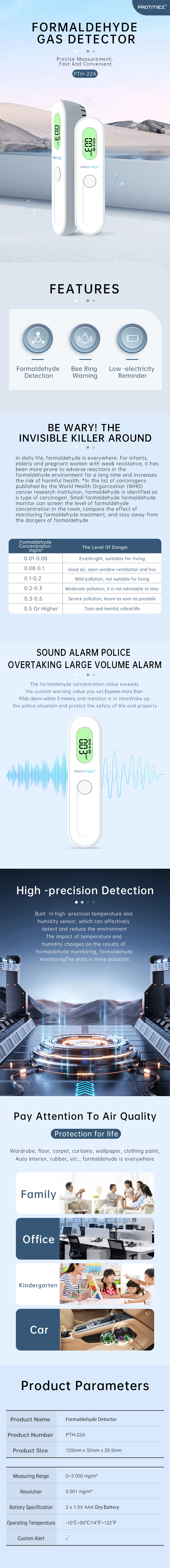 The PTH-22A features an IR Detector, offering continuous measurement and displaying the current ambient formaldehyde concentration.It also includes an audible siren alarm when exceeding the standard. Perfect for daily use.