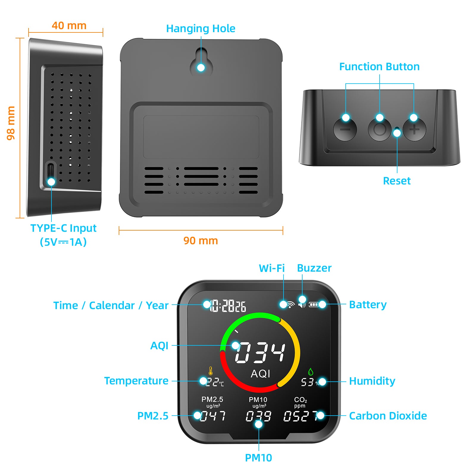 Monitor your indoor air quality with the PTH-9AW. This versatile device detects PM2.5, PM10, humidity, carbon dioxide, and time AQI levels, ensuring a healthy environment in your home or office. Stay informed and in control with WIFI connectivity.